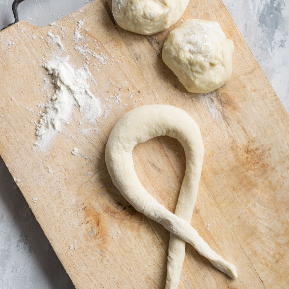Обминаем, делим на 6 частей. Каждую раскатываем ладонями в жгут, в центре которого утолщение. Концы перекрещиваем перед собой, затем второй раз и закрепляем концы по бокам.