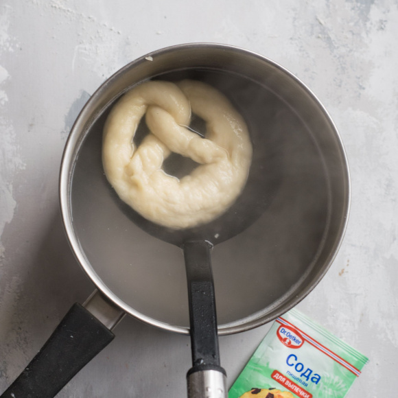 Вскипятим в кастрюле 1,5 л воды, добавим соду и опустим при помощи шумовки каждый брецель в кипящую воду на 30 секунд.