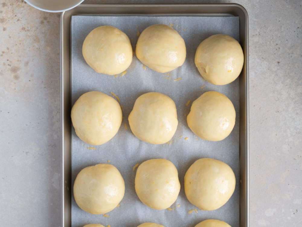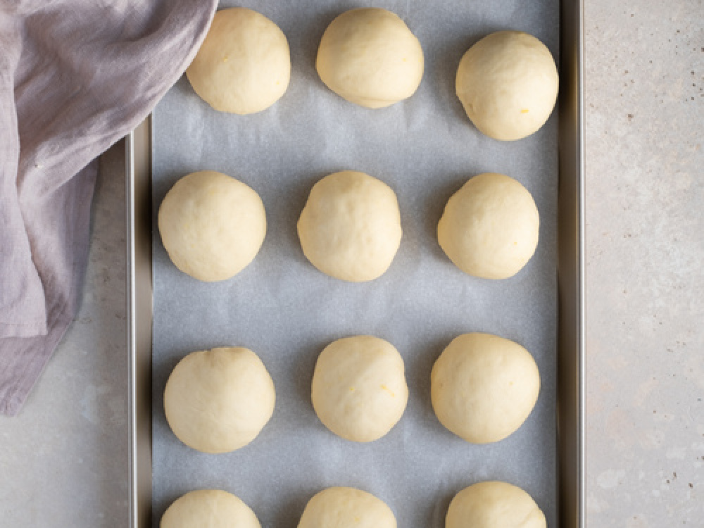 Делим тесто на 12 частей и формируем шарики. Выкладываем их на противень, застеленный пекарской бумагой, накрываем полотенцем ещё на 20 минут, чтобы тесто немного подошло.