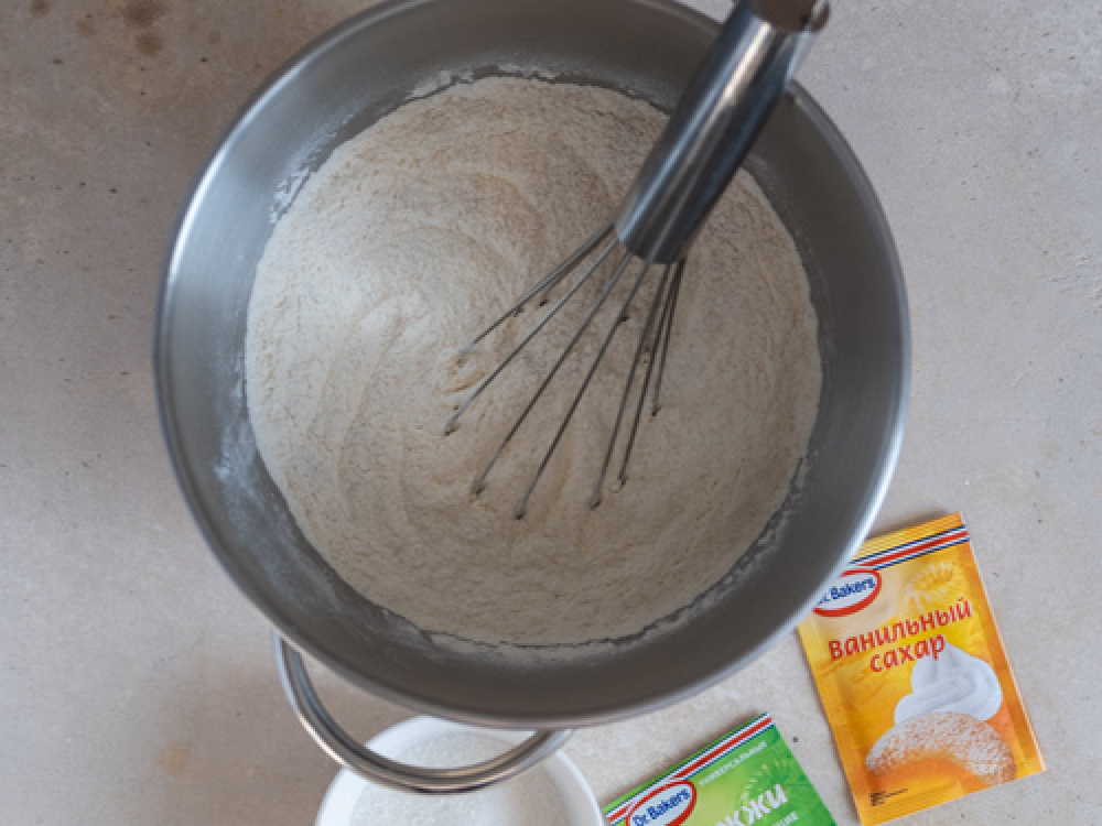 Муку просеиваем в большую миску. Добавляем дрожжи, сахар, соль, ванильный сахар и перемешиваем.