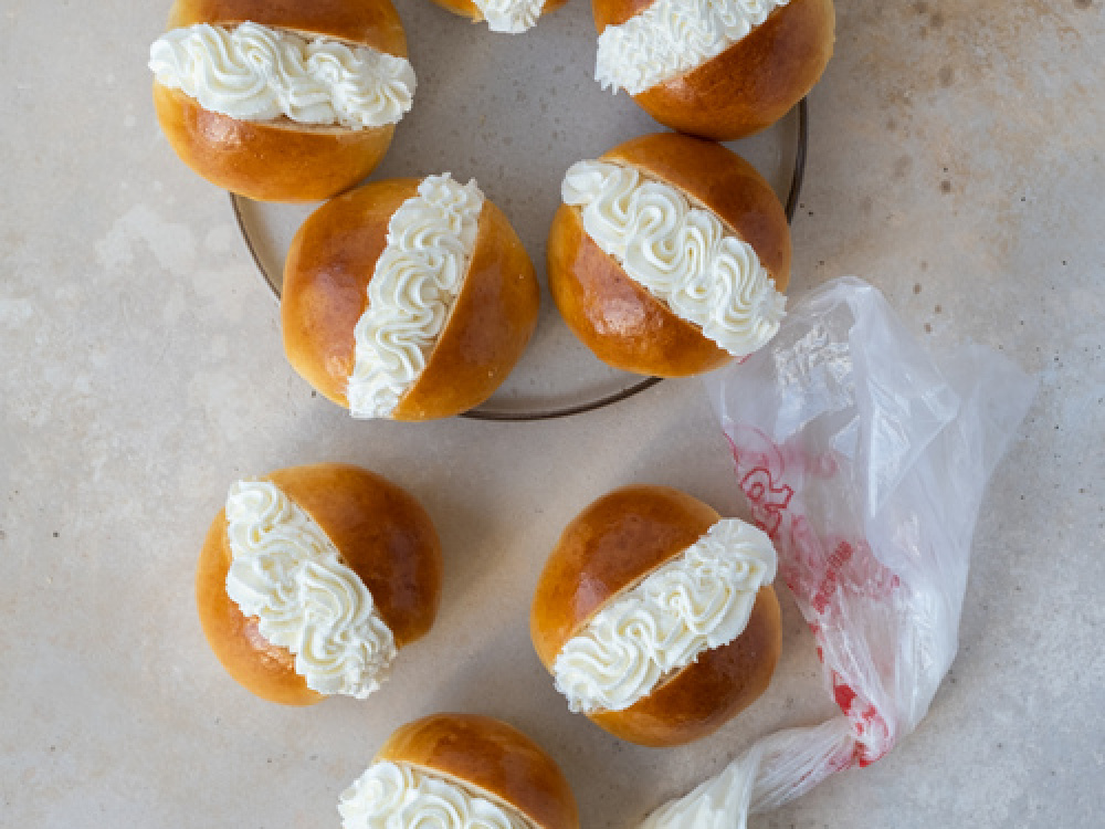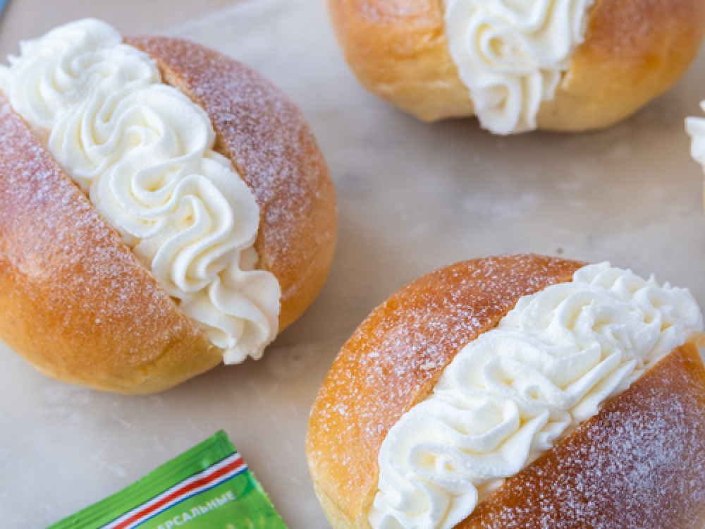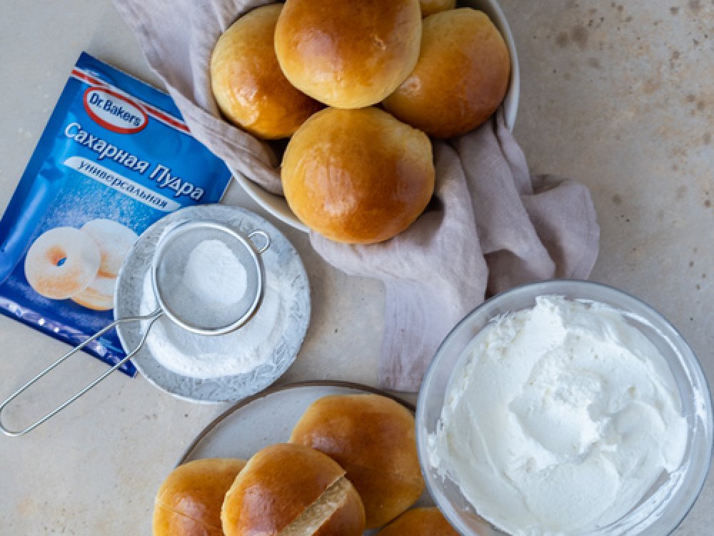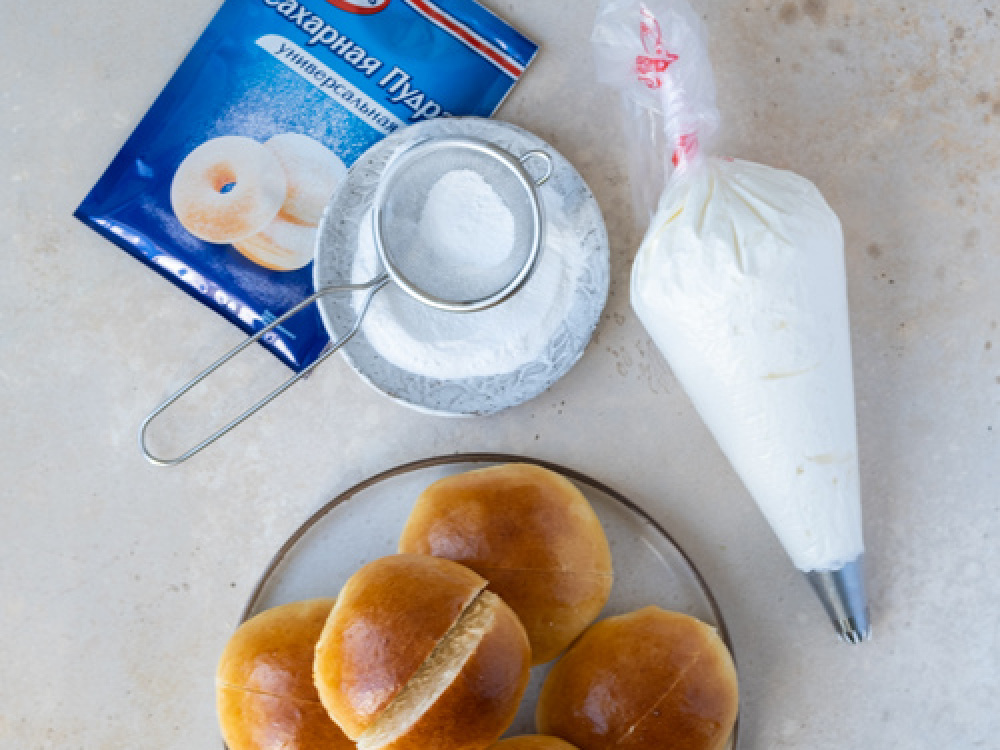 Крем перекладываем в кондитерский мешок. Заполняем булочки кремом.
