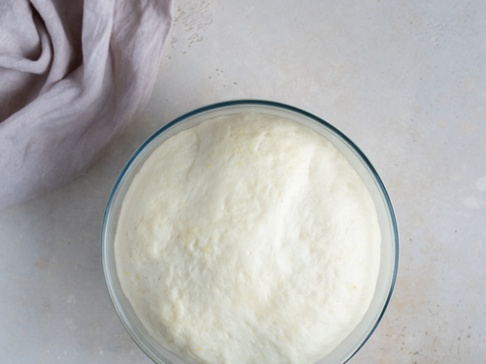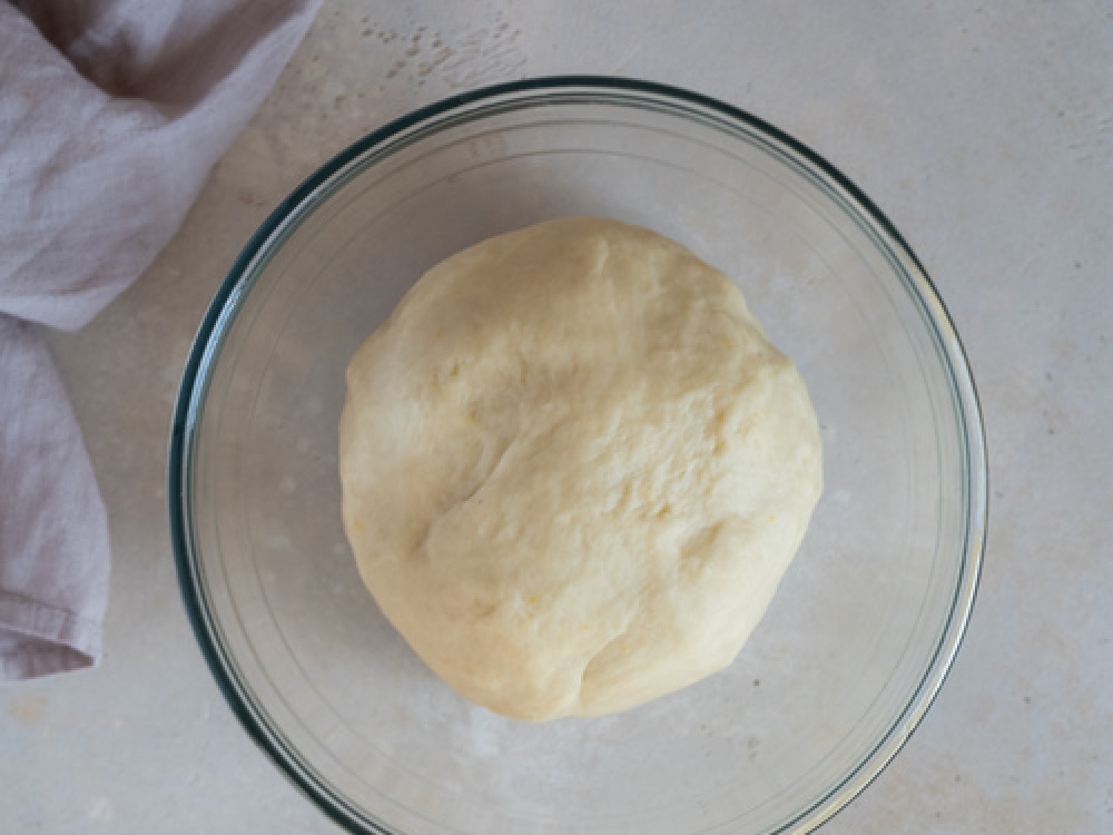 Должно получиться мягкое и пластичное тесто. Перекладываем его в чистую миску, смазанную маслом, накрываем плёнкой или полотенцем и оставляем на расстойку в тёплом месте на 1 час. За это время тесто должно увеличиться в два-три раза.