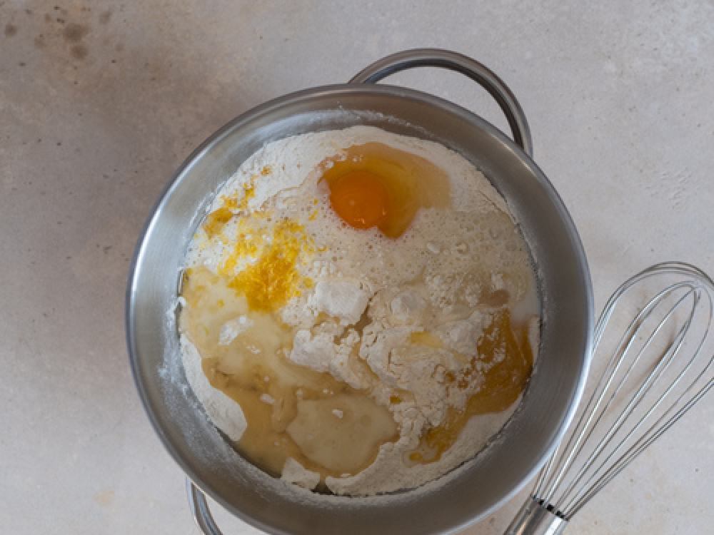 Делаем в муке углубление, вливаем в него тёплое молоко, масло, мёд и яйцо. Добавляем цедру.