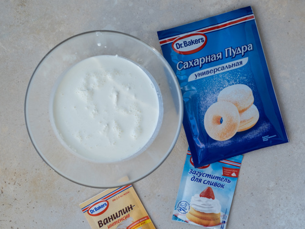 Для крема взбиваем холодные сливки в течение 1 минуты, добавляем загуститель и пудру, продолжаем взбивать до воздушного состояния.