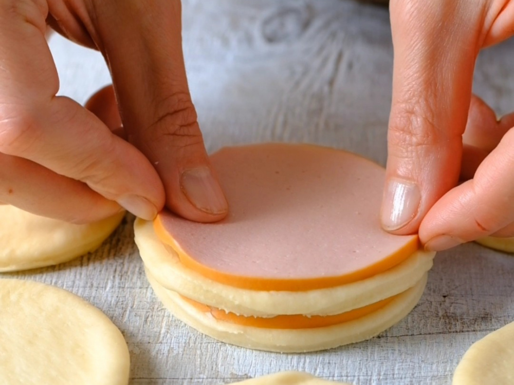 Колбасу (400-500 г) режем на круги толщиной около 4-5 мм. Поверх кружка из теста выкладываем кружок колбасы, далее ещё тесто и ещё колбасу. Закрываем сверху последним кружком теста. Должно получиться пять слоёв: два — колбасы и три — теста.