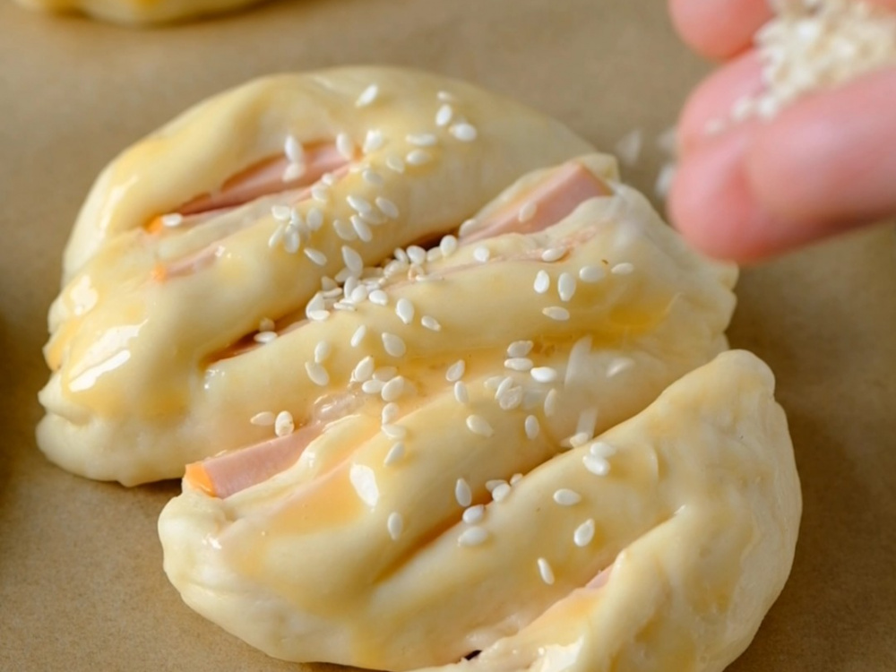 Перекладываем булочки на противень, смазываем их смесью желтка и молока, посыпаем кунжутом.