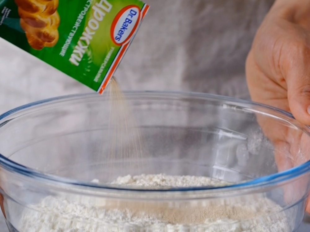 Дрожжи (7 г) смешиваем с мукой (500 г), солью (1 ч. л.) и сахаром (1 ст. л.).