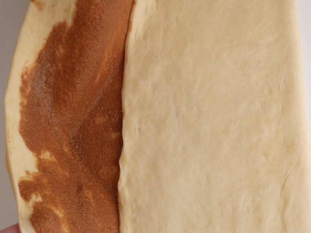Тесто раскатываем в прямоугольный пласт, распределяем начинку и заворачиваем.