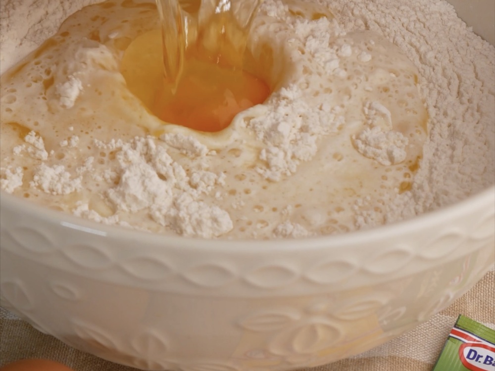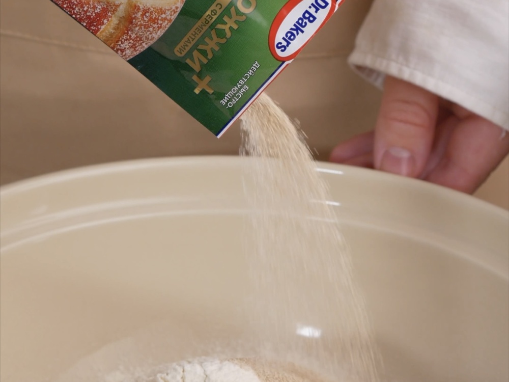 Шаг 1 Муку (500 г) смешиваем с «Дрожжами+» Dr. Bakers (8 г), ванильным сахаром Dr. Bakers (1 уп.), обычным сахаром (70 г) и солью (1/2 ч. л.).