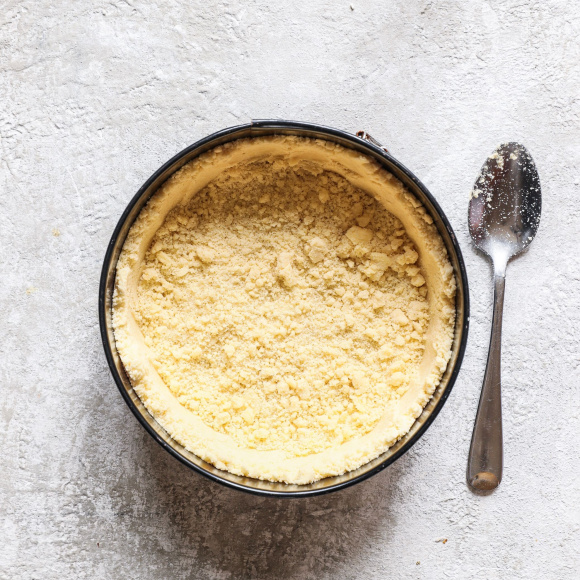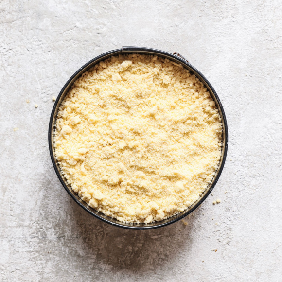Смажьте небольшим количеством сливочного масла разъемную форму для выпекания диаметром 24 см. 2/3 части крошки распределите по посуде, ложкой сформируйте бортики королевской ватрушки.