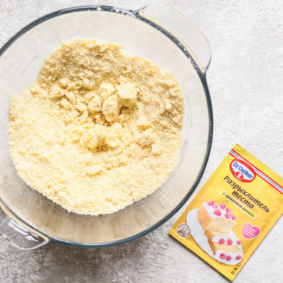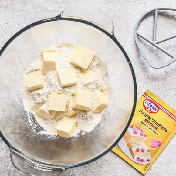 Чтобы сделать тесто, используйте миксер. 250 г охлажденного сливочного масла нарежьте кубиками, оно должно быть хорошо замерзшим. Поместите его, 300 г муки и 3 г разрыхлителя теста с ароматом ванили Dr. Bakers в чашу миксера.