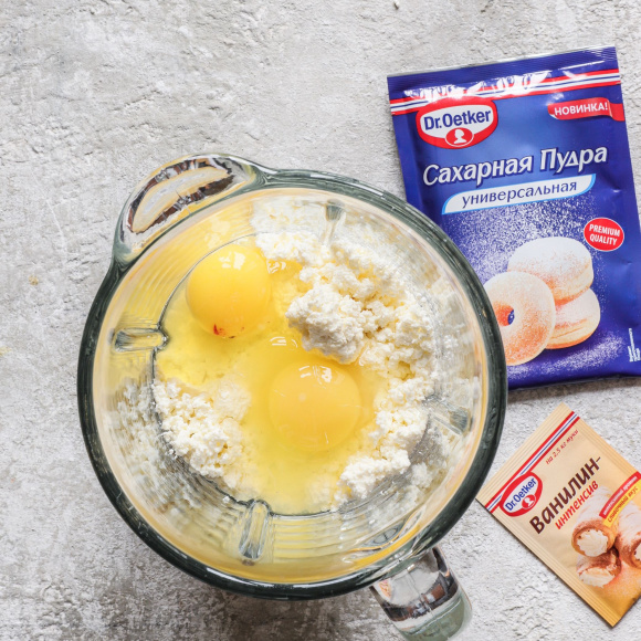 Сначала готовим содержимое для королевской ватрушки. Для этого в миску переложите 200 г сахарной пудры с ароматом ванили Dr. Bakers, 2 куриных яйца, 50 мл сливок, а также 400 г творога.