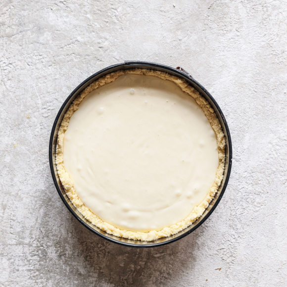 Выложите творожную смесь в песочную основу. Для выравнивания используйте лопатку.