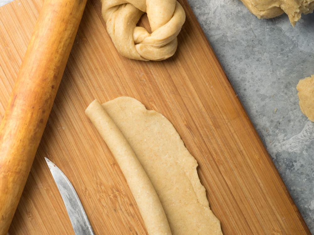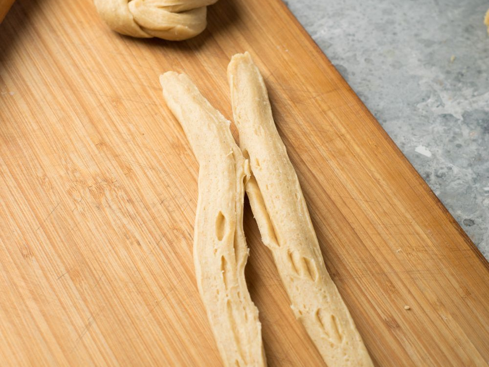 Тесто делим на шесть частей. Каждую раскатываем в прямоугольный пласт и сворачиваем рулетом по длинной стороне.