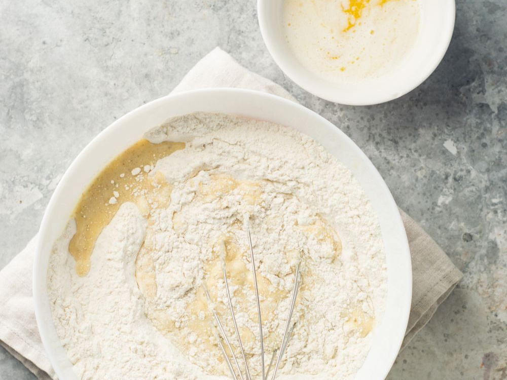 Вливаем жидкую часть к муке и слегка перемешиваем.
