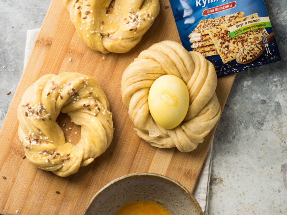 Выпекаем при 180° 15-20 минут до золотистого цвета, кладём в каждое колечко крашеное яйцо и подаём к столу. Приятного аппетита!