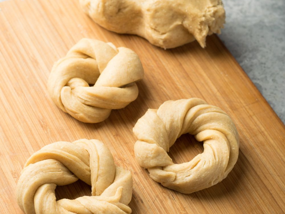 Разрезаем рулет пополам, перекручиваем между собой две половинки и соединяем в кольцо, концы скрепляем.
