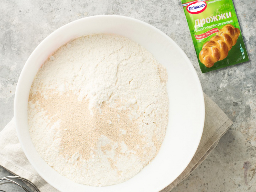 Муку смешиваем с дрожжами и оставляем на 10 минут для взаимодействия.