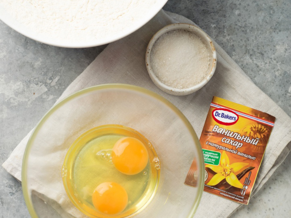 Яйца взбиваем с сахаром и ванильным сахаром.