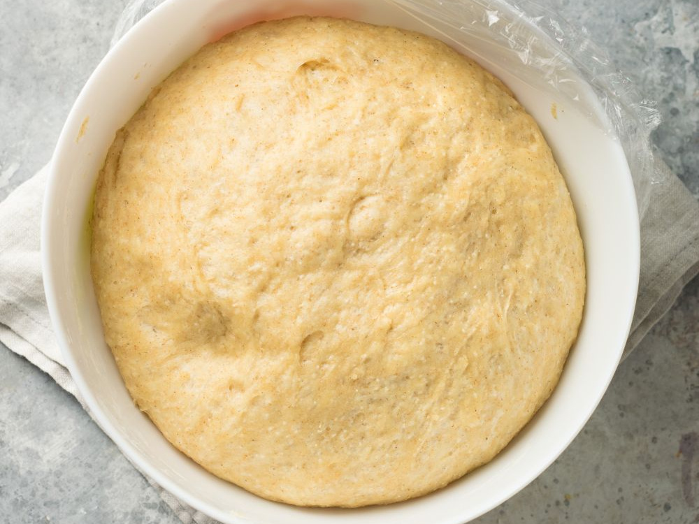 Тесто накрываем пищевой плёнкой и оставляем в тёплом месте на 1,5-2 часа до увеличения в три раза.