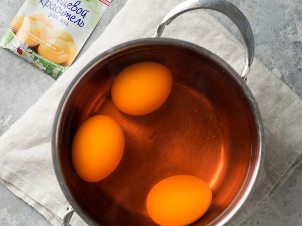 Варим яйца 10 минут на среднем огне. Разводим краситель в кастрюле, согласно инструкции на упаковке, опускаем в него вареные яйца и держим пару минут. Достаём, оставляем остыть.