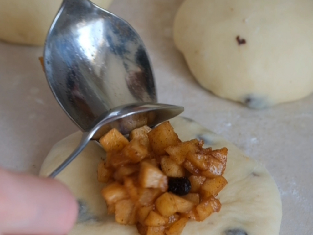 Подошедшее тесто делим на 10-12 равных частей и формируем из каждой шарик. Раскатываем каждый кусочек, в центр помещаем начинку. Скрепляем края и переворачиваем швом вниз.