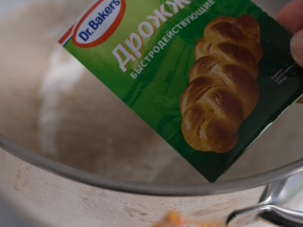 Муку (500 г) смешиваем с дрожжами (7 г), сахаром (100 г), ванильным сахаром (8 г) и солью (1/2 ч. л.).