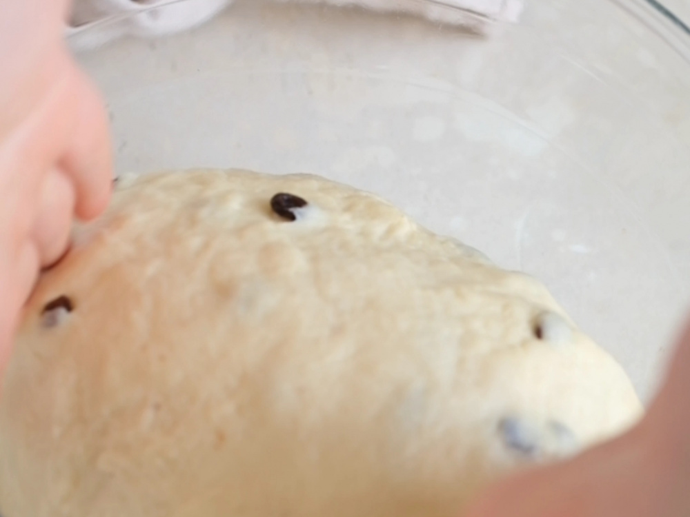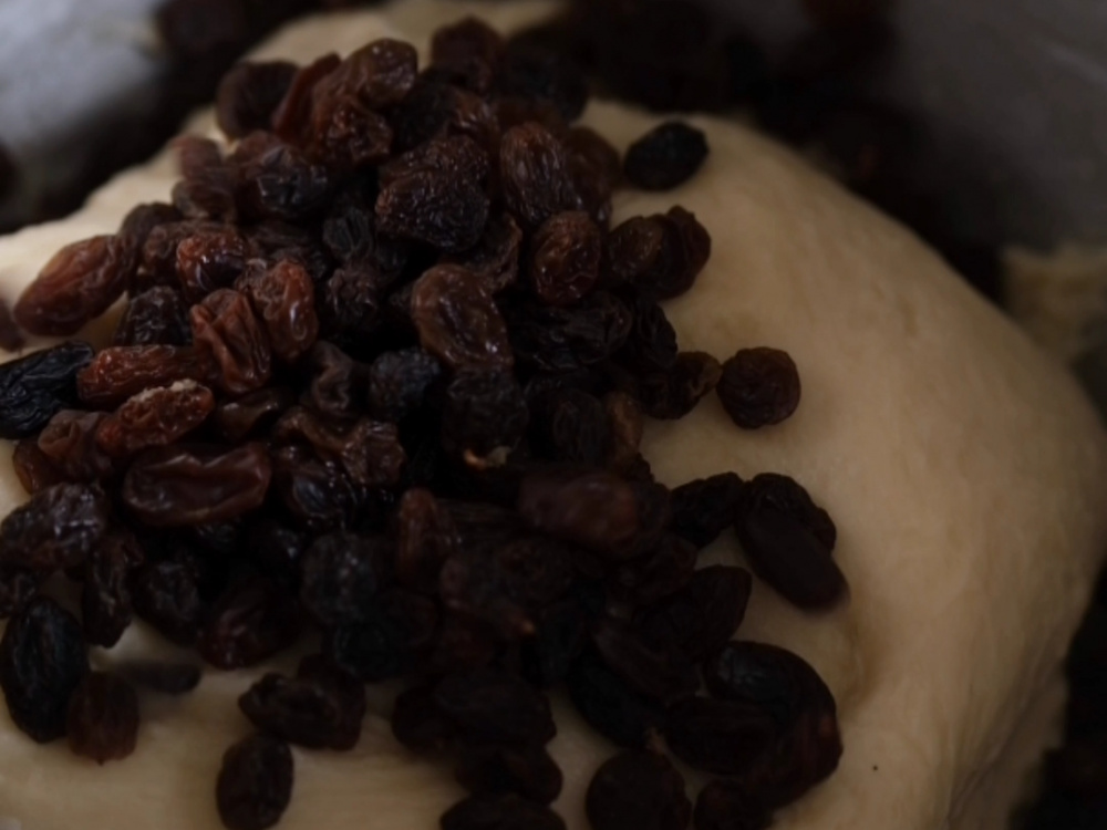 Вымешиваем тесто минимум 10 минут. Добавляем промытый изюм (50 г) и аккуратными движениями вмешиваем его в тесто.