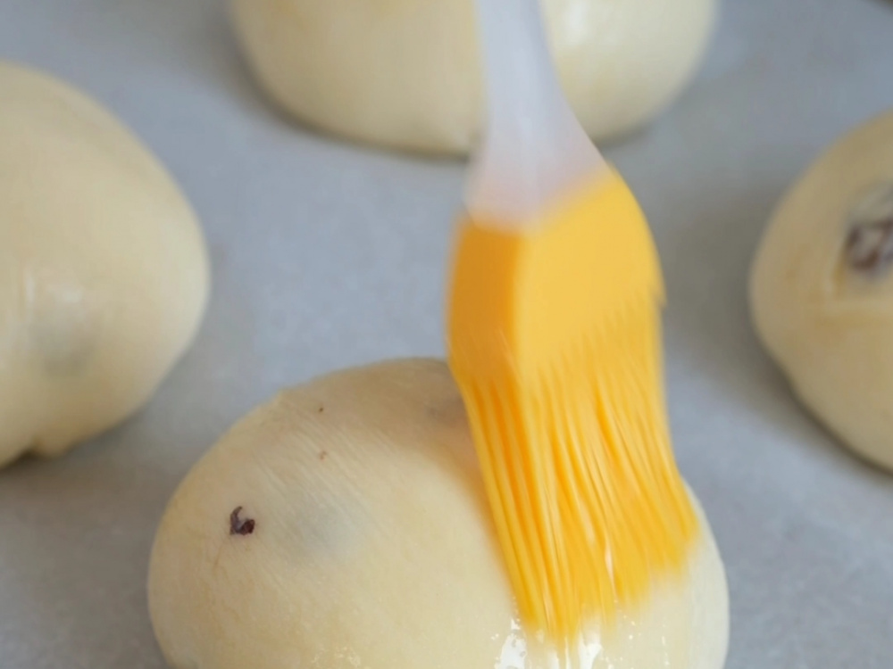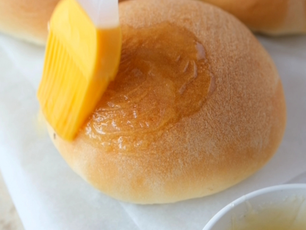 Выкладываем булочки на противень, застеленный пекарской бумагой, и смазываем растопленным сливочным маслом (20 г).