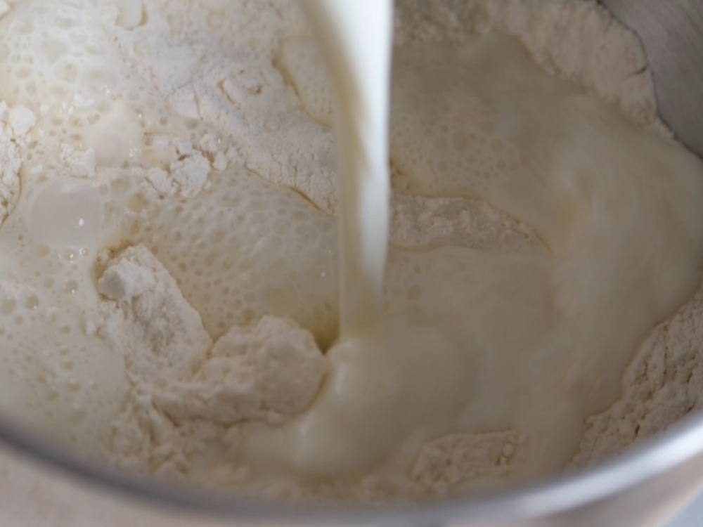 Вливаем тёплое молоко (250 мл). Добавляем 1 яйцо и мягкое сливочное масло (60 г).