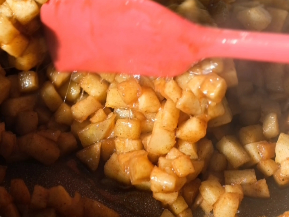 В это время готовим начинку. Яблоки (3-4 шт.) моем, чистим и режем на мелкие кубики. Добавляем сахар (50 г), лимонный сок (1-2 ст. л.), ванильный сахар (15 г) и корицу (2 ч. л.). Смешиваем и томим в сотейнике до выпаривания лишней жидкости. Остужаем.