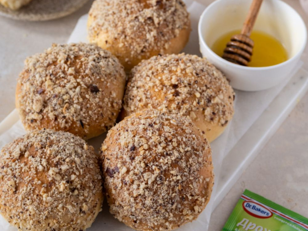 Даём булочкам немного остыть. Покрываем их смесью из мёда (3 ст. л.) и растопленного сливочного масла (20 г) и обваливаем в дроблёных орехах (100 г). Приятного аппетита!