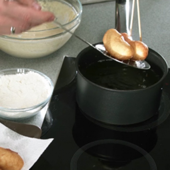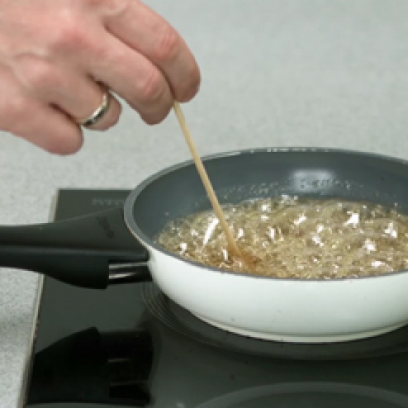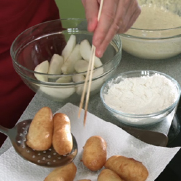 Груши помыть, очистить от кожуры, нарезать ломтиками, удалить сердцевину, сбрызнуть лимонным соком. Растительное масло нагреть во фритюрнице или высокой кастрюле примерно до 170-180°C.