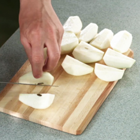 Извлечь ломтики груш и дать стечь маслу, разложив их на бумажном полотенце.