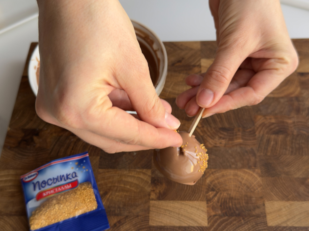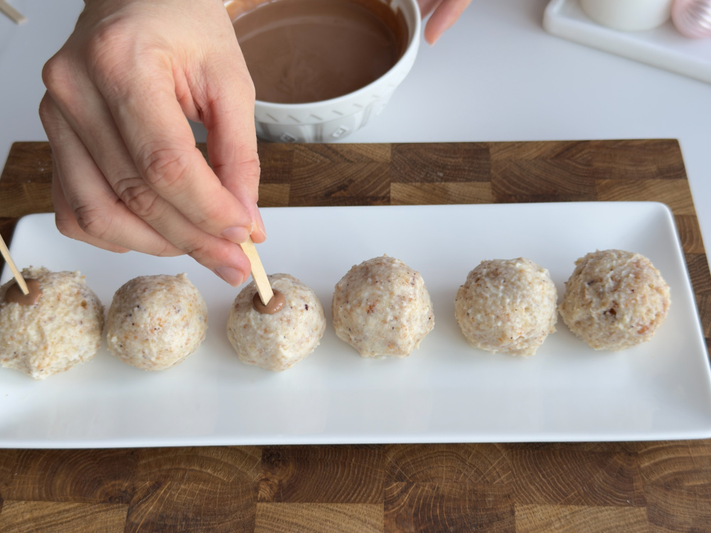 Теперь по рецепту будем придавать нашим шарикам форму домашних кейк попсов. Кончик деревянной шпажки окунем в горячую жидкую шоколадную массу, сразу проткнем кейк попс. Шоколад застынет и закрепит сладость на палочке. Как только палочка зафиксируется, окунем кейк попс полностью в шоколад. Чтобы дать глазури красиво подсохнуть, воткните палочки с домашними конфетками в пенопласт или картонную коробку, так они не будут падать.