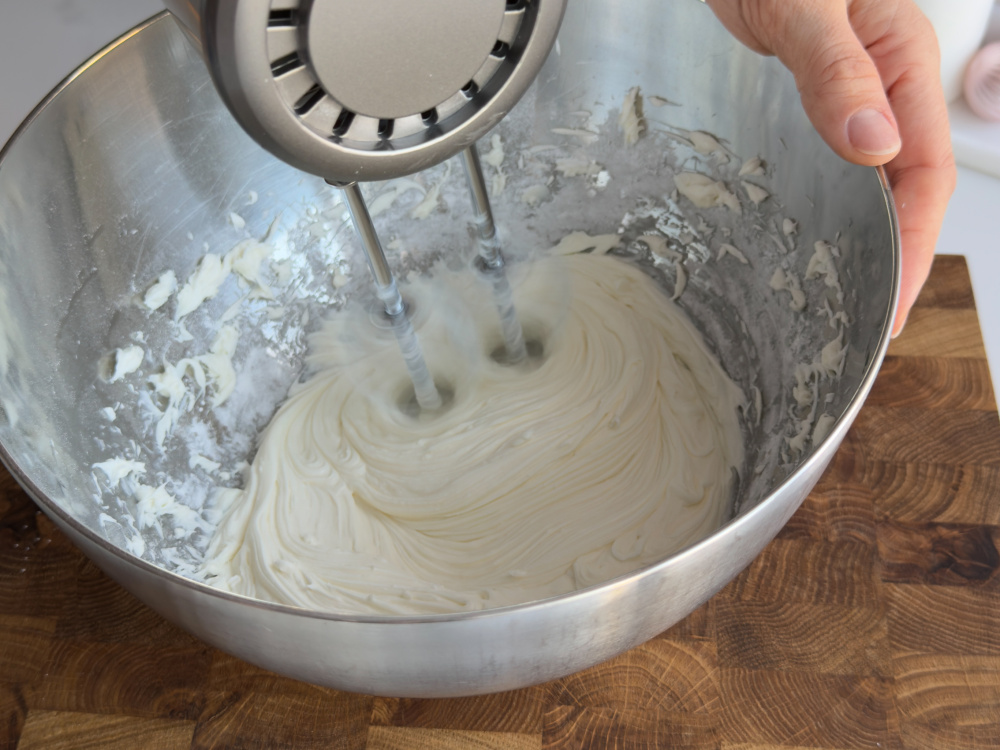 Для рецепта домашних кейк попсов воспользуйтесь стационарным (планетарным) миксером. Он прекрасно взобьет яйца до устойчивой пены, что руками делать долго и тяжело. Если такого аппарата дома нет, возьмите ручной, но рецепт приготовления кейк попсов рассчитан с учетом планетарного миксера. В чашу положим яйца, сахарный песок, включим аппарат сперва на низкую скорость, потом перейдем на среднюю, затем – высокую. Доведем яично-сахарную смесь до кремообразного состояния. Теперь будем добавлять муку. Сначала перемешаем ее лопаткой, иначе вся разлетится по кухне.