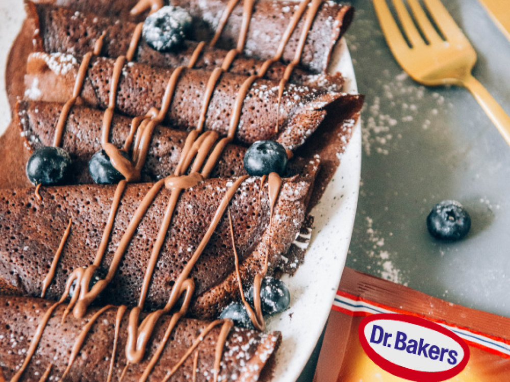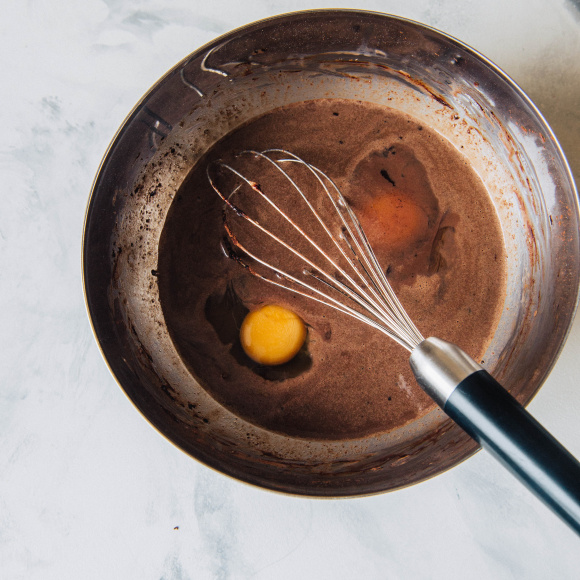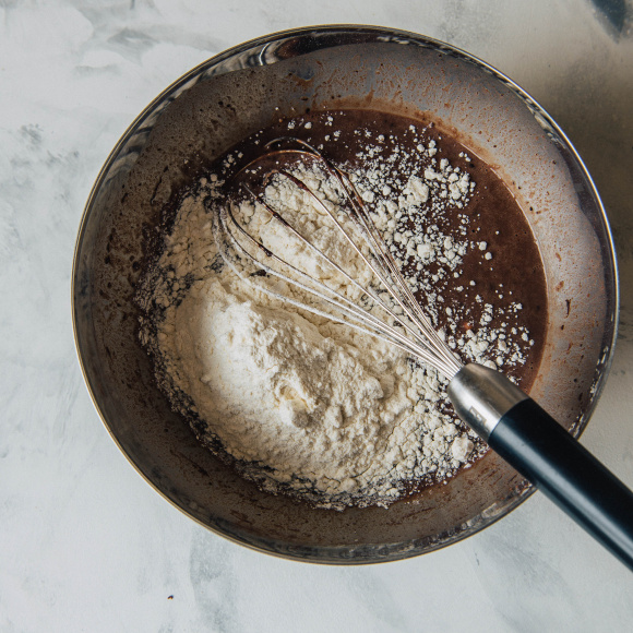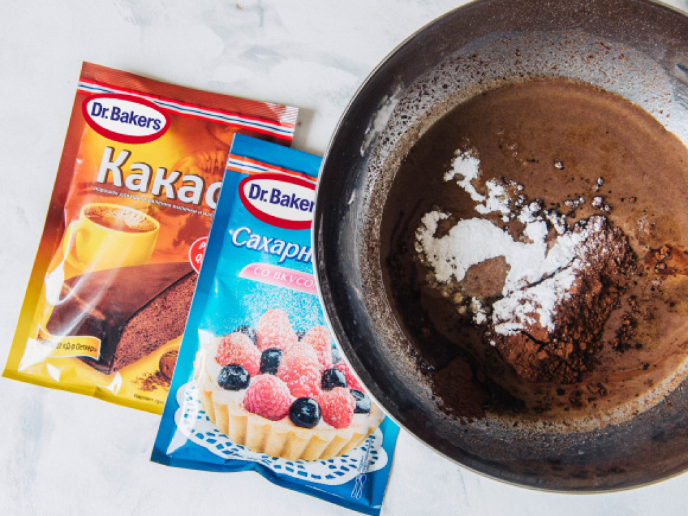 Снимаем смесь с огня и переливаем в чистую сухую чашу с высокими бортами. Добавляем какао порошок Dr. Bakers, щепотку соли, сахарную пудру Dr. Bakers и оставшееся холодное молоко. Хорошо перемешиваем смесь.