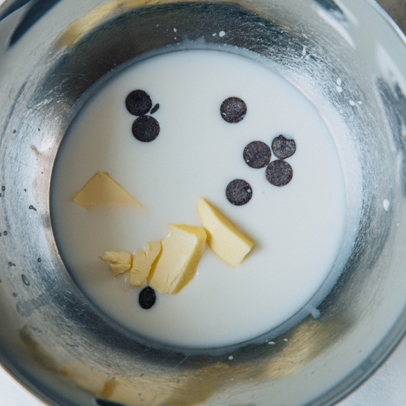 250 мл молока наливаем в сотейник. Сливочное масло нарезаем и добавляем к молоку, высыпаем шоколадные капли (можно заменить измельченным темным шоколадом) и ставим смесь на водяную баню.