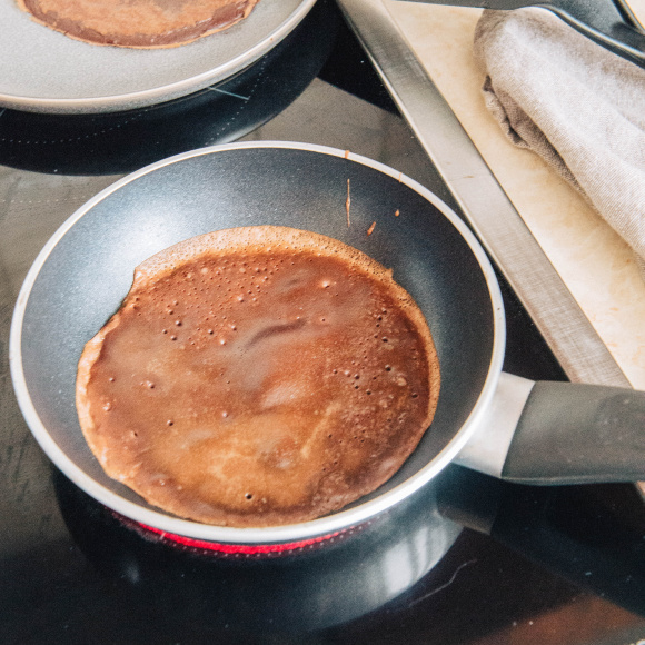 Блинную сковороду разогреваем. На среднем огне выпекаем блинчики. Жарим с каждой стороны до румяного цвета. Готовые блины складываем стопкой, при желании смазывая кокосовым маслом.