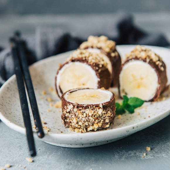 На каждый кусочек намазываем шоколадную пасту, посыпаем молотыми орехами или кокосовой стружкой. Перекладываем роллы на сервировочное блюдо и подаем к столу. Приятного аппетита!