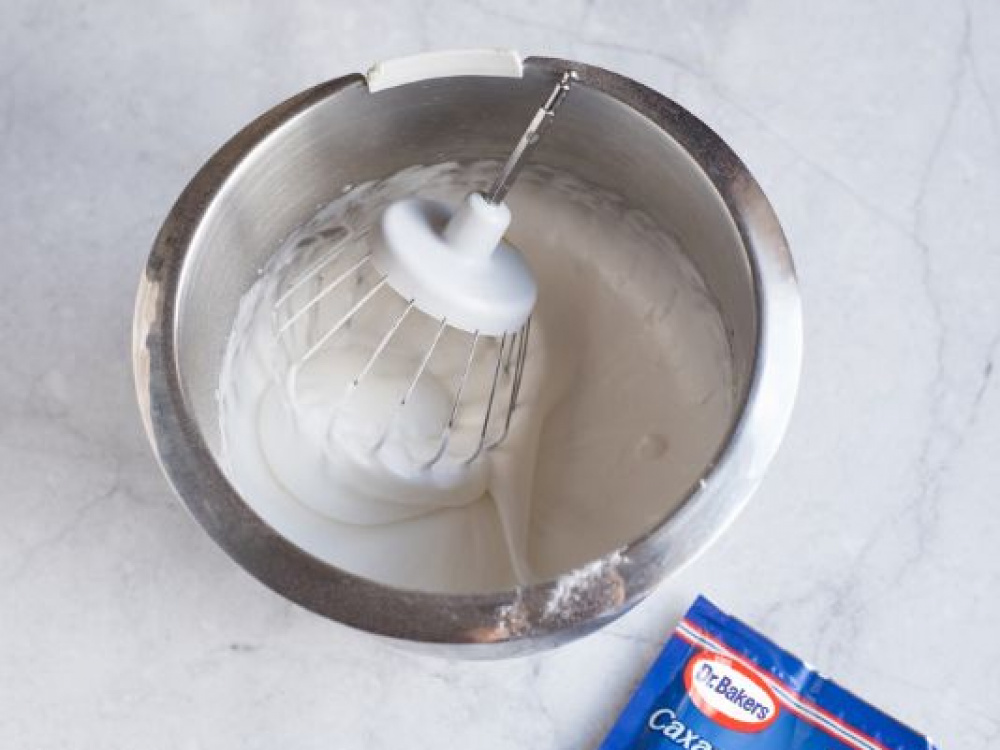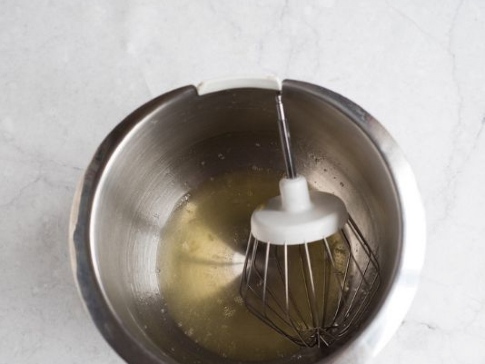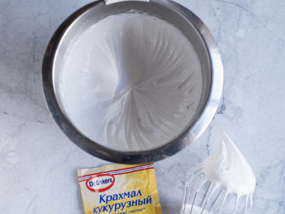 Тонкой непрерывной струйкой всыпаем сахарную пудру, взбивая меренгу до плотной, густой, блестящей белой массы.