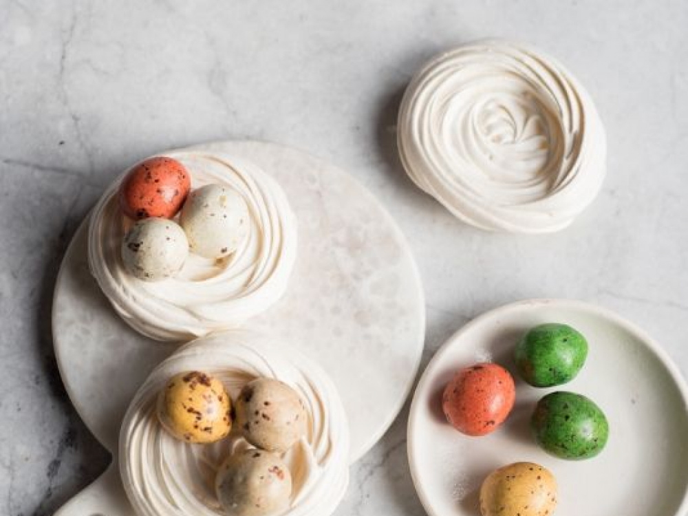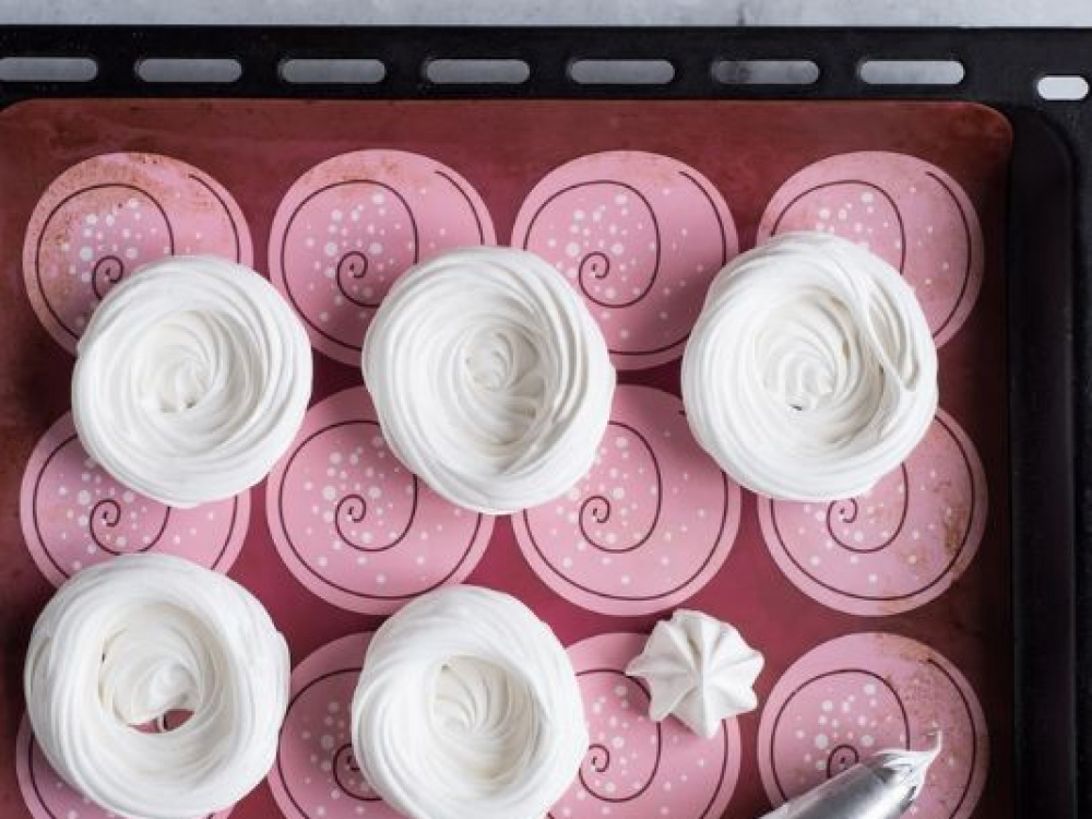 Отсаживаем круглые заготовки в форме гнёзд на силиконовый коврик или пергаментную бумагу. Сушим в духовке при 90°C 90 минут или пока меренги полностью не высохнут и не будут легко отставать от коврика.