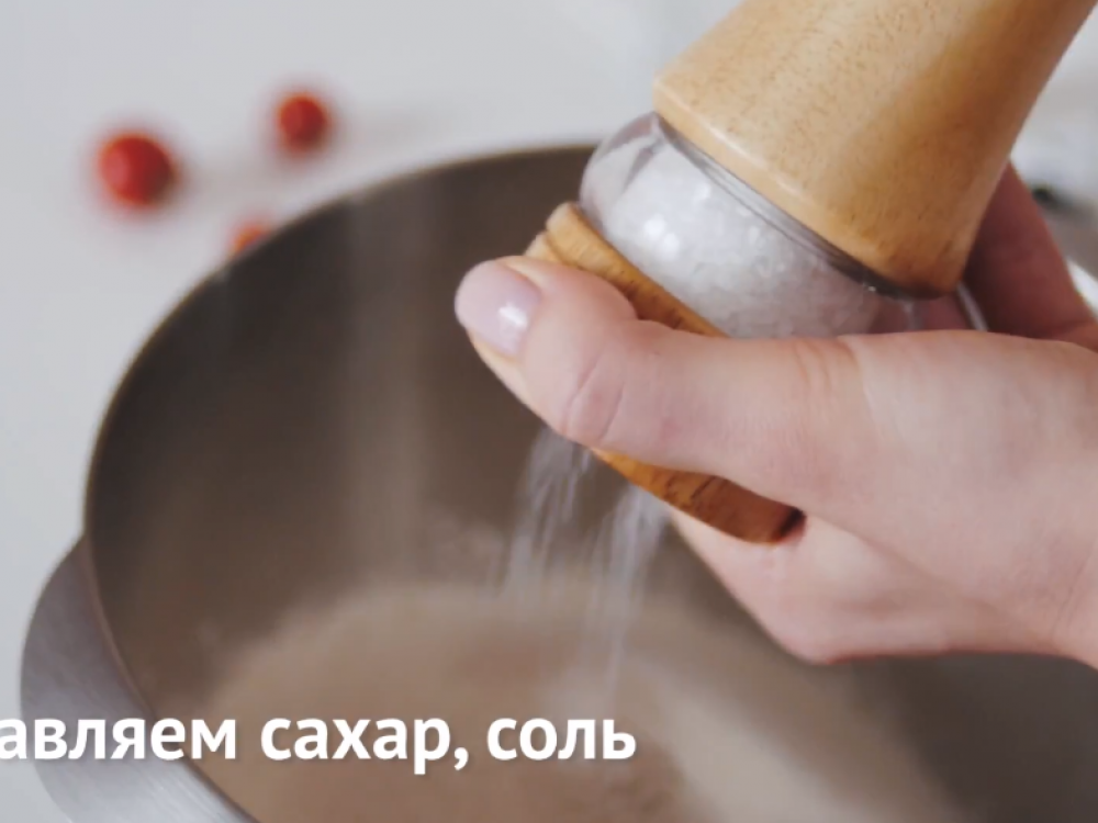 Добавляем сахар, соль. Вводим тёплую воду