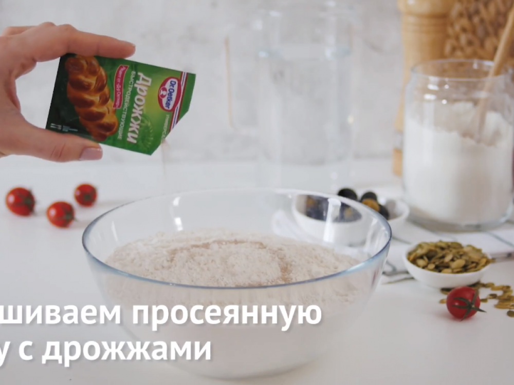 Делим тесто на 3 равные части и в каждую вводим наполнители (томаты / тыквенные семечки / оливки).