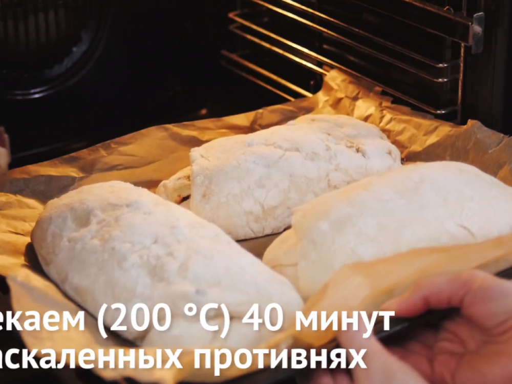 Выпекаем при температуре 200°C 40 минут на раскалённых противнях. В процессе выпекания дважды опрыскиваем духовку водой.