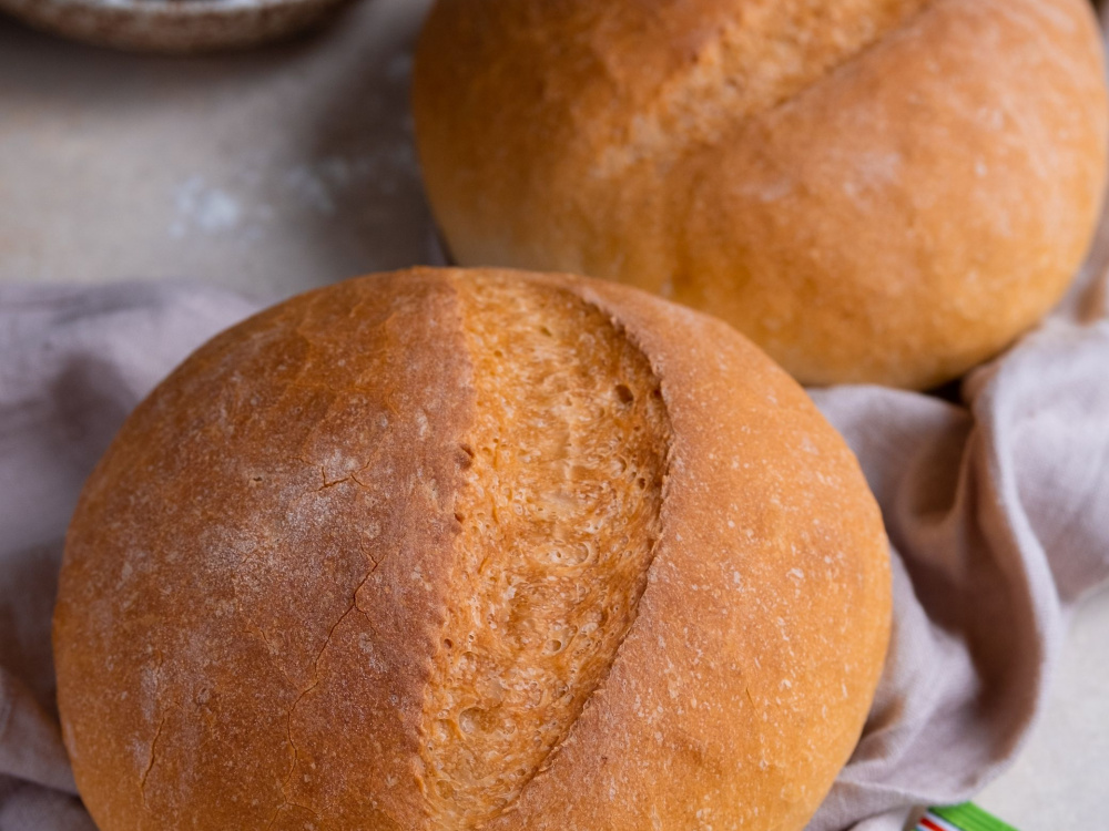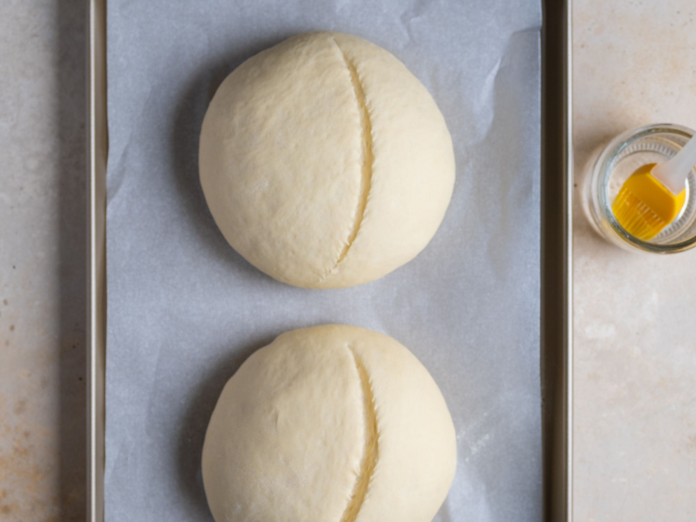 Обминаем тесто и делим на две равные части. Из каждой части формируем круглую булку. Выкладываем заготовки на противень, накрываем полотенцем и даём подойти 20-30 минут. Делаем надрезы и отправляем в духовку. Предварительно смазываем поверхность хлеба водой.