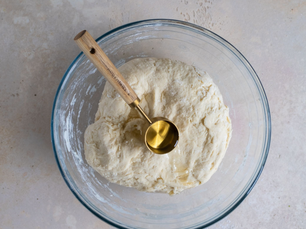 Вымешиваем тесто до эластичного состояния около 10 минут, в конце добавляем растительное масло (1 ч. л.).