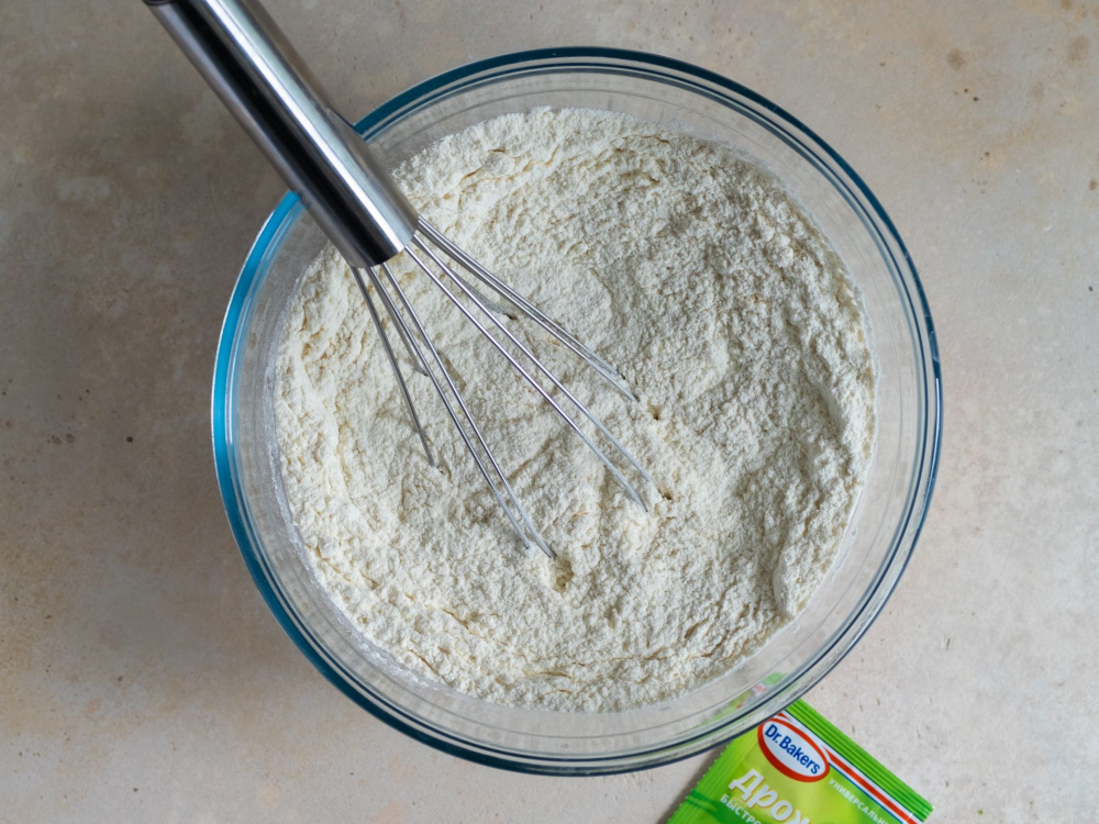 Дрожжи (7 г) смешиваем с просеянной мукой (500 г) для равномерного распределения.