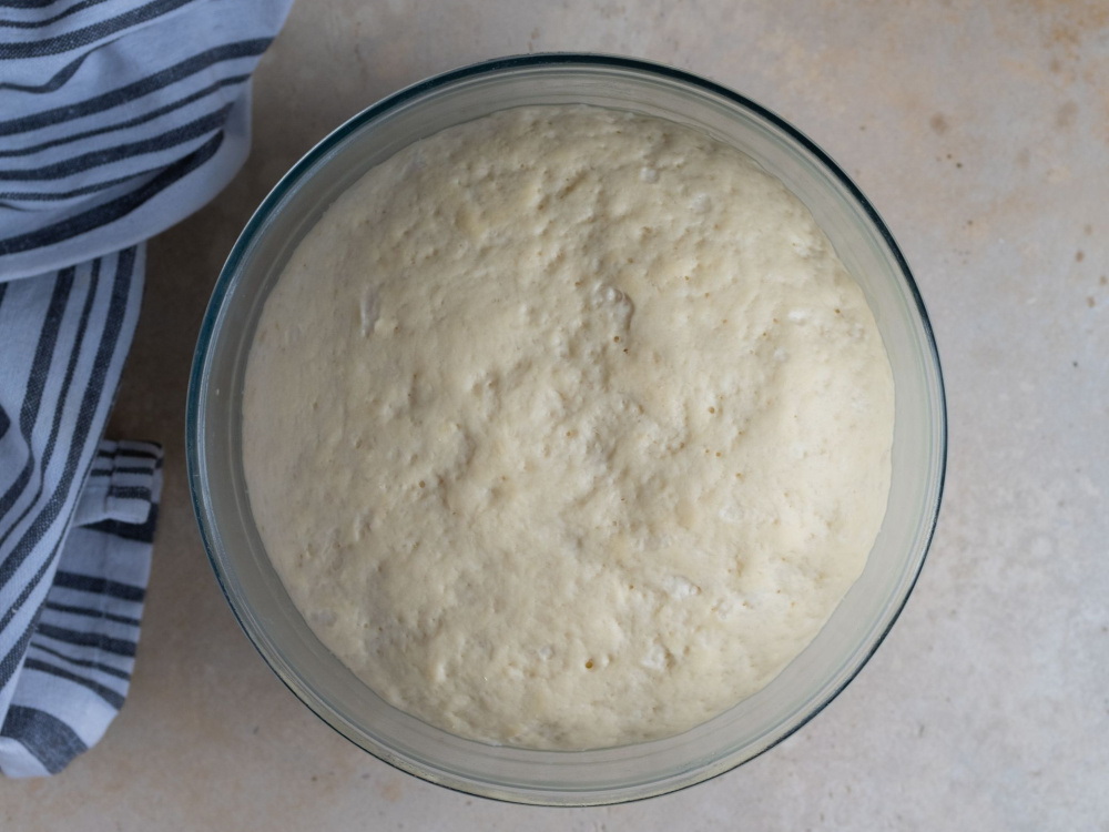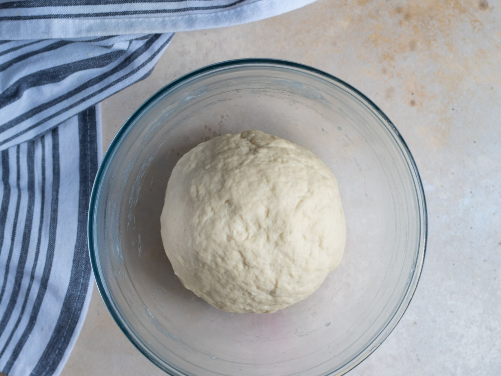 Формируем из теста шар, помещаем его в чистую миску, смазанную маслом, и накрываем полотенцем.