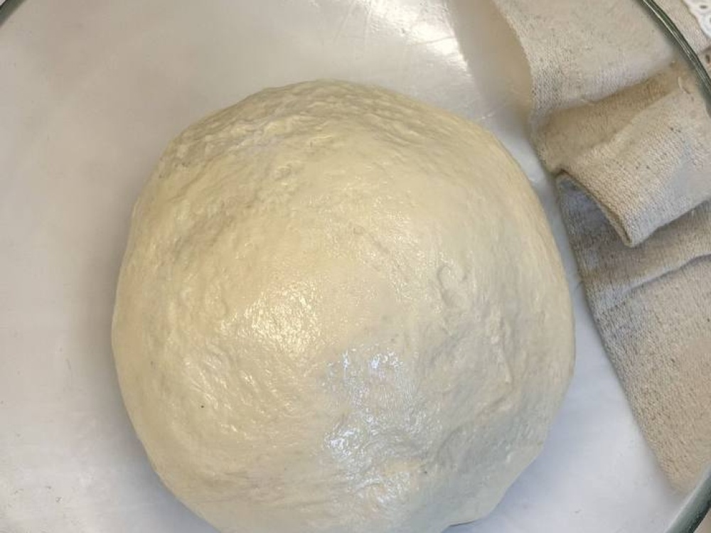 Вымесим тесто и в конце вольем растительное масло. Тесто должно получиться однородным, не жестким. Оставьте его под полотенцем, пусть приподнимется. Помесите его один раз, выпустите лишний воздух.